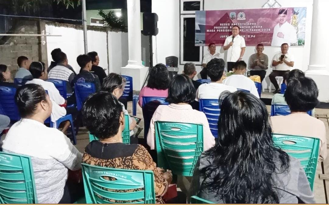 NRT, Tarakan : Ketua Komisi III DPRD Provinsi Kalimantan Utara, Jufri Budiman, kembali melaksanakan kegiatan reses masa sidang 2026. Pada reses keempat ini, ia menyapa dan berdialog langsung dengan warga di RT 20, Kelurahan Juwata Laut, Kecamatan Tarakan Utara, Kota Tarakan.
